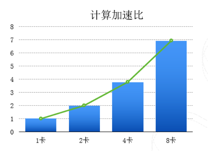 支持如此大规模的离线图像模型训练,则是阿里云提供的GPU高性能服务器,以及基于多服务器,多GPU卡和高速网络连接的集群模型训练(内部称之为PAI-Pluto, PAI是阿里云机器学习平台的代号,欢迎申请试用),主流的GPU卡的计算能力要远远强于CPU。下图是Pluto在跑深度学习模型时的计算加速比。
