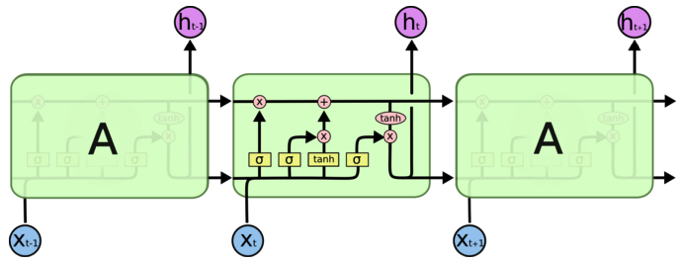 在整行模型的识别中,主要使用的是LSTM技术,相比RNN,LSTM能更好的解决梯度衰减(gradient vanishing)的现象。LSTM的基本结构如下图所示,通过多个门电路的结合,使得LSTM可以有效的学习到较长时间序列之间的关系。