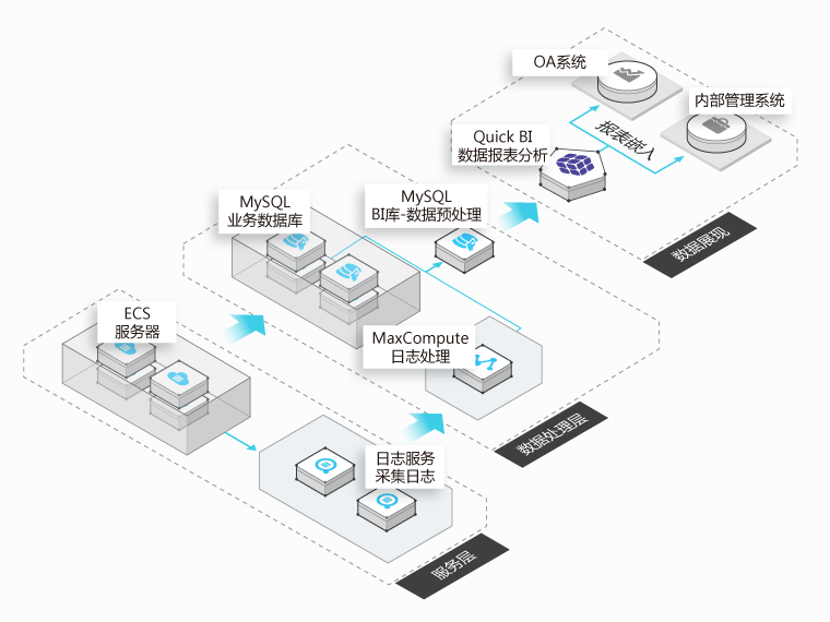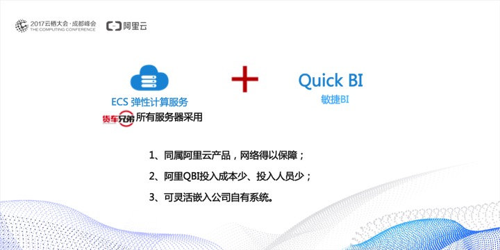 于是我们基本的方式就从原来的业务系统ECS就是弹性计算服务,把Quick BI接入到上面来部署数据服务和支持。