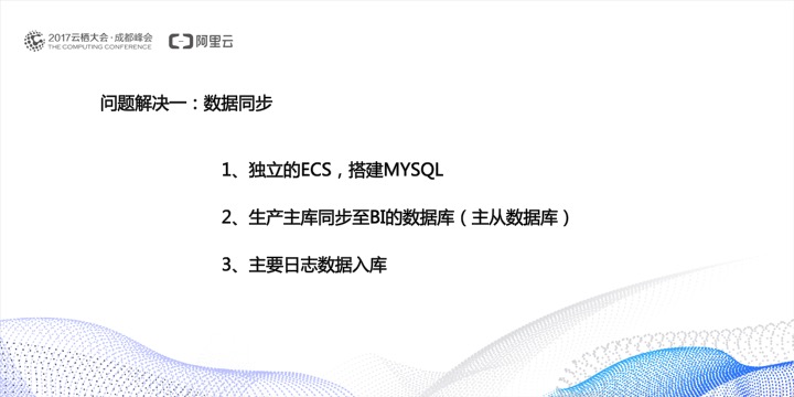 于是我们的业务生产数据库和Quick BI的这个数据库,它们之间一个同步。要保证他们的组成关系,却又不影响生产数据库的正常运作。